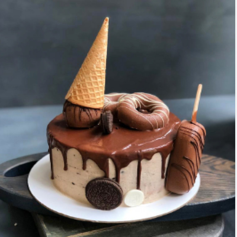 Максимально шоколадный открытый торт с подтёками и завитками из шоколада. Нижний ярус — мягкий шоколадный бисквит со слегка солоноватым сырно-шоколадным кремом. Над ним — три воздушных муссовых слоя из тёмного, молочного и белого шоколада на бисквитной основе, пропитанной сахарным сиропом с добавлением ликёра.